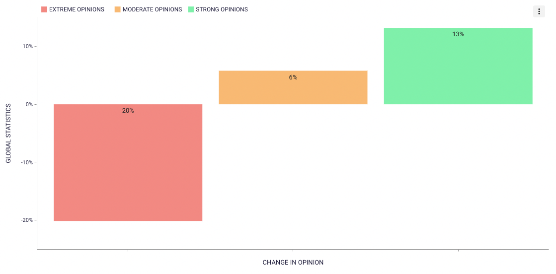 Instances of Extreme Opinions decreased by 20% - Instances of Moderate Opinions Increased 6% - Instances of Strong Opinions increased by 13%