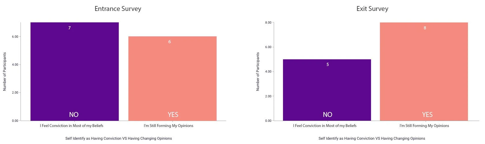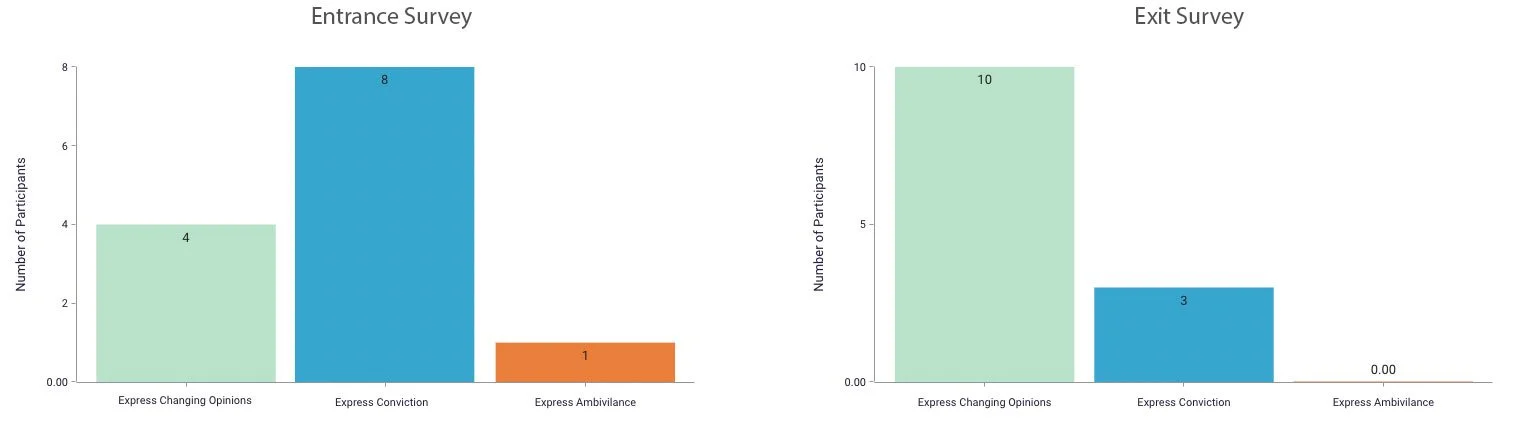 From the 8 chart carousel above, I think there are 2 very distinct patterns to mention. First, Extreme Opinions decreased or stayed the same in every single category. In addition, Strong Opinions increased in every single topic accept opinions about Labour Unions. Delving into the data on labour unions, we see that there was an overall decrease of opinions given from the Entrance to Exit Surveys. In the Entrance Survey 12 of the 13 participants gave an opinion on labour unions, however only 9 of 13 participants gave an opinion on the topic in the Exit survey. Furthermore, it was the only topic in which participants abstained on the Exit more than on the Entrance survey. Meaning, in every other topic the number of opinions selected was either the same or increased from the Entrance to the Exit Survey.