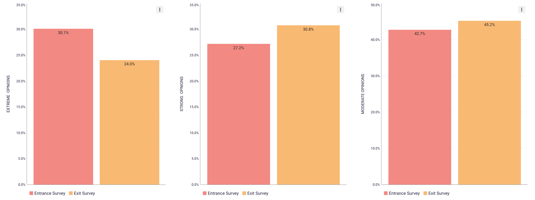 Did opinions overall become more or less extreme? The first chart below presents the increase or decrease in types (Extreme, Moderate, Strong) of opinions across all questions (globally) between the Entrance and Exit survey. For example, if the total number of 5's (Extreme opinions) selected increased from 100 in the Entrance Survey to 109 in the Exit Survey, the below chart would show a 9% increase in Extreme Opinions. As can be seen below, the results from the survey show that instances of Extreme Opinions decreased by 20% for participants when taking the Exit survey.
